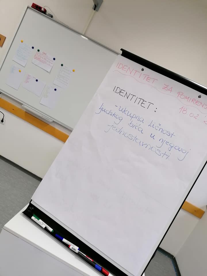 Učenice i učenici III1 sa koordinatoricom profesoricom Ditom Vrbanjac, odnosno učesnici projekta MIROVNO OBRAZOVANJE, su u četvrtak 18. februara 2021., realizovali još jednu radionicu na kojoj su savladali pojam identiteta i shvatili da se identitet sastoji iz različitih elemenata koji čine ljudsko biće složenim, a što je svakako važno za odnose sa drugima i drugačijima, na putu pomirenja i tolerancije.